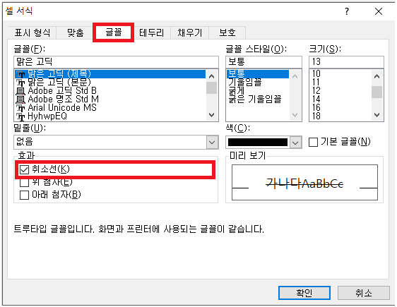 아래쪽 효과의 "취소선"에 체크를 해줍니다.