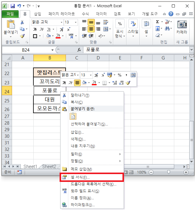 "마우스 오른쪽 버튼 하신다음 [셀 서식(F)]를 선택" 해줍니다.